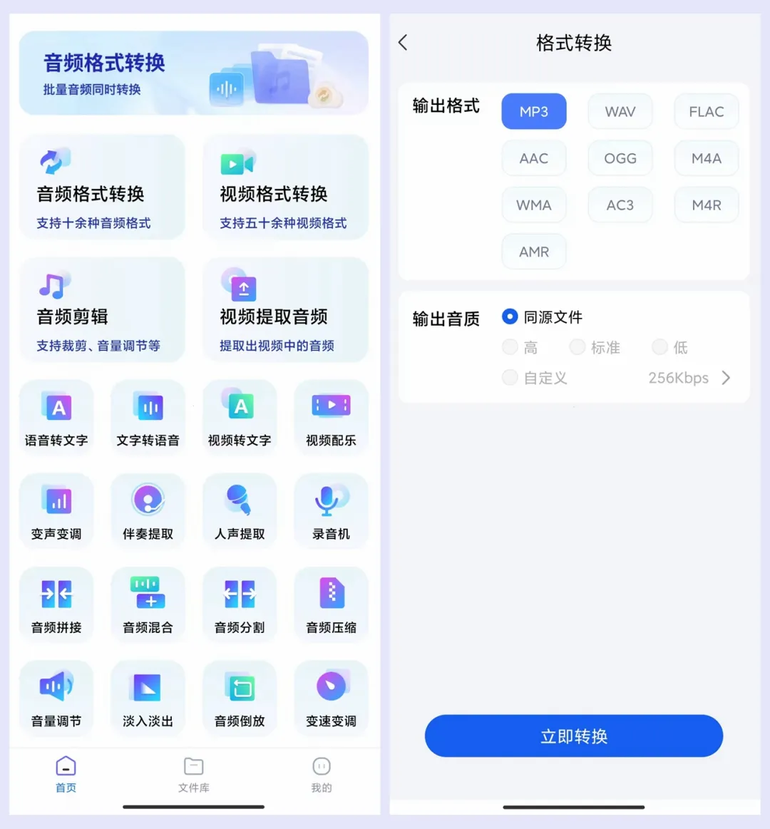 像音频格式转换,支持包括PM3,WAV,PLAC,AAC,OGG,M4A,WMA,AC3,M4R,AMR等十余种音频格式。
